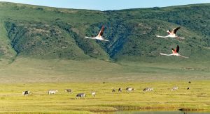 the bigger part of the crater floor is covered by open grassland, which turns yellow in the dry months of June with wildflowers. The Magadi Soda Lake in the Ngorongoro Crater is a major attraction for the beautiful flamingos in addition to other thousand species of water birds, whereas predators hide in the marshland from where they ambush their prey that comes to drink the water of the river which feeds into the lake. Furthermore, there are swamps on the crater floor, that provide water and shelter to elephants hippos, and several smaller creatures like frogs, lizards, and snakes. It is very rewarding to view game around the beautiful Lake Makadi as large antelope such as gazelles plus zebras come to have a drink here, whereas herds of hippopotami bask in the thick mud on the lakeshore.