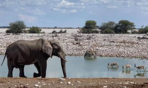 The late afternoon offered a more interesting experience. As I seated on a bench with a refreshing Windhoek beer, a majestic herd of elephants gracefully made their way towards the waterhole, walking direct to the waterhole. They spent some time drinking, bathing, and having dust baths. Alongside them, a few giraffes, gemboks, and a solitary rhino joined them.
